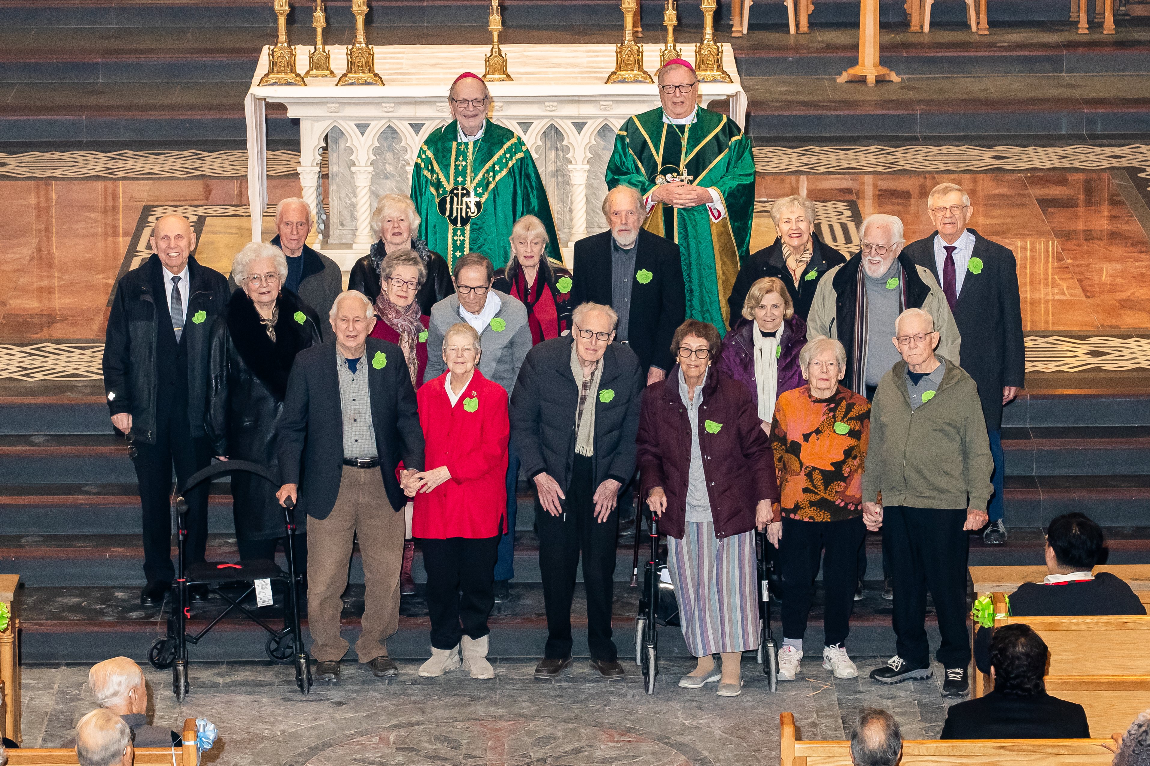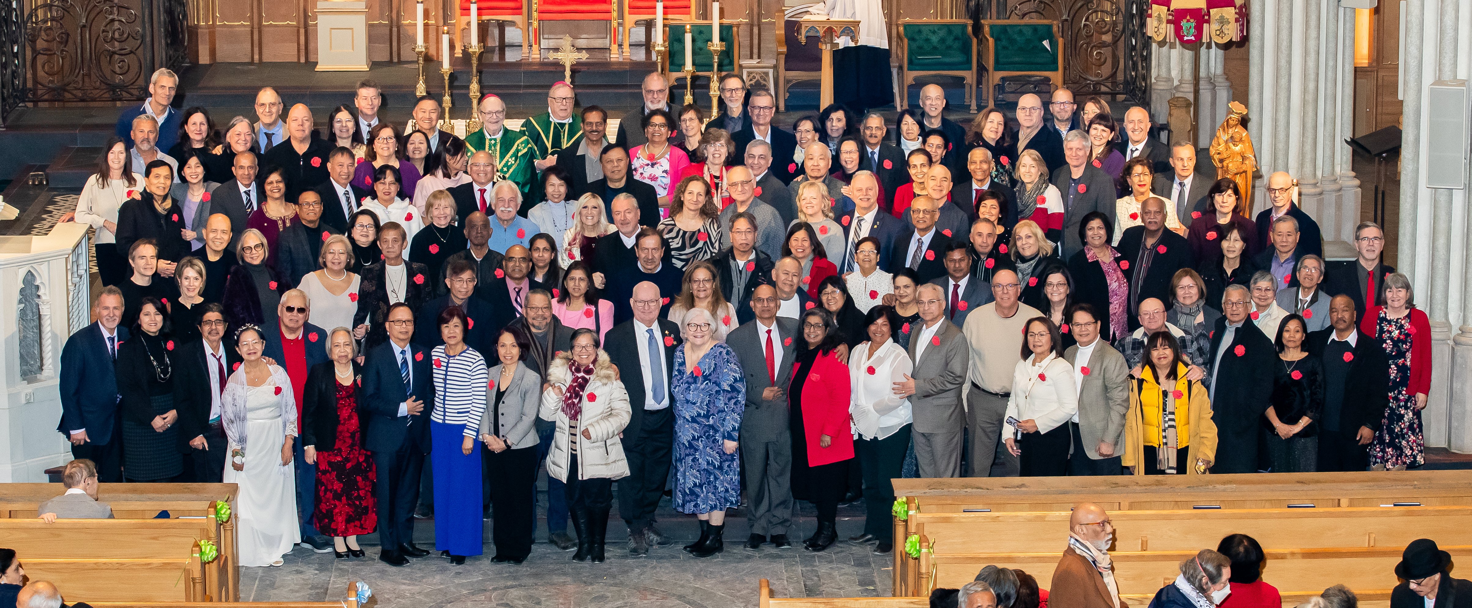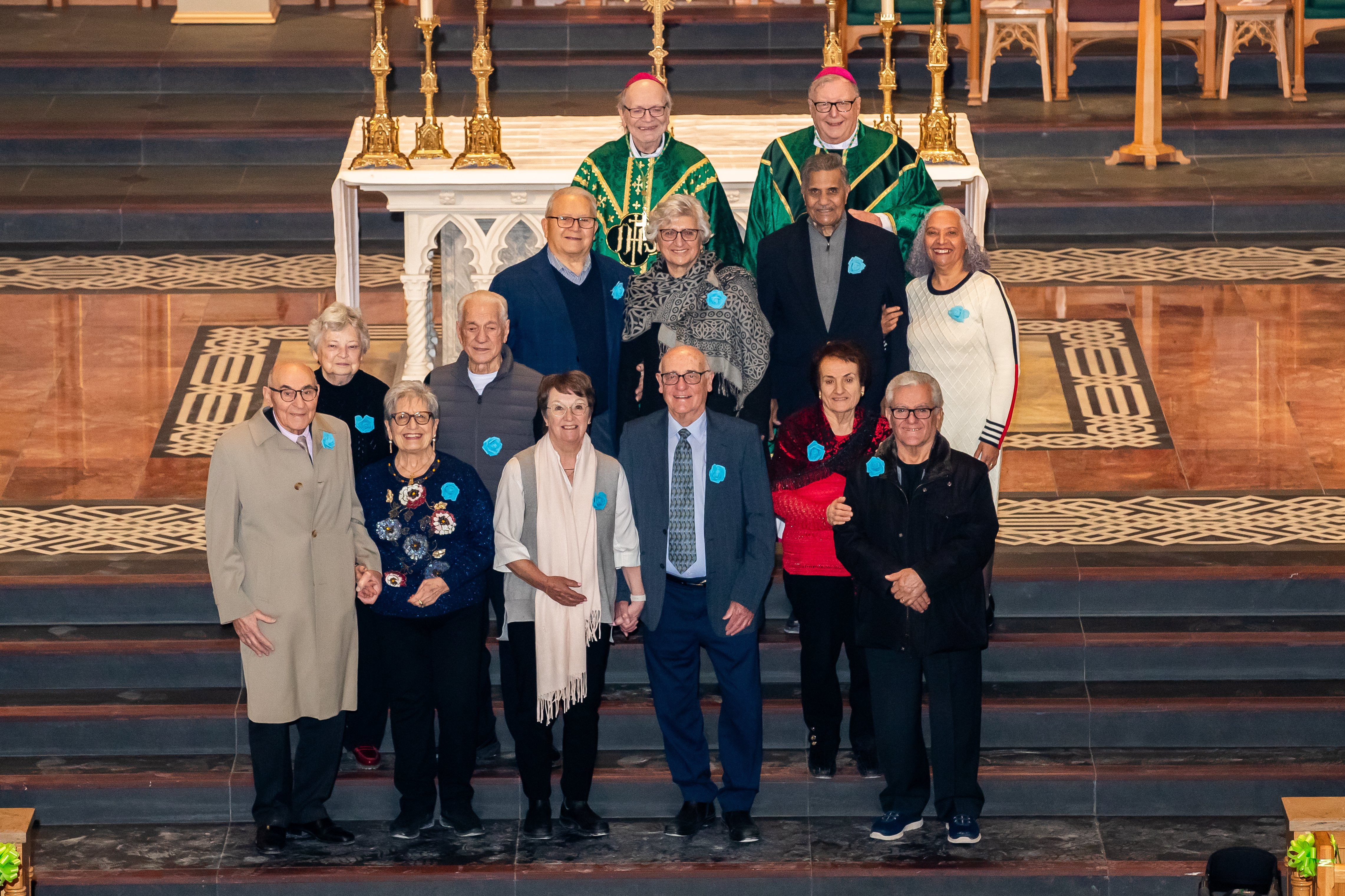 Over 1,000 family members and friends of honoured couples attended the celebration in the downtown cathedral basilica.  The Most Rev. John Boissonneau, Auxiliary Bishop of the Archdiocese of Toronto celebrated Mass, with Auxiliary Bishop Robert Kasun concelebrating. In his homily Bishop Boissonneau spoke about the importance of the commitment to the sacrament of marriage, a shining example to the world: